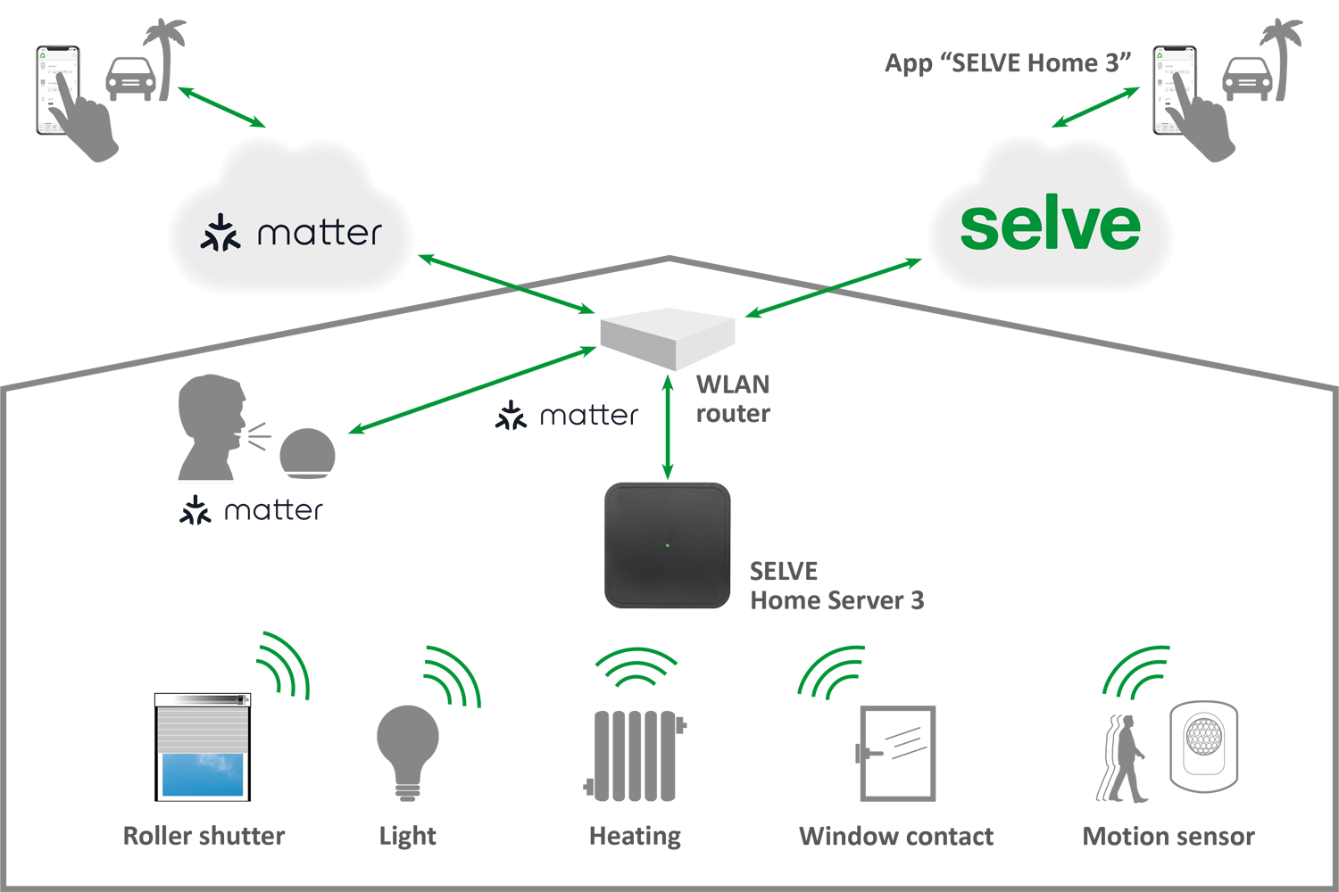 Example 2: With an existing internet connection, the following features are possible: operation from outside your own Wi-Fi (via SELVE Cloud), external control, and voice control via Matter.